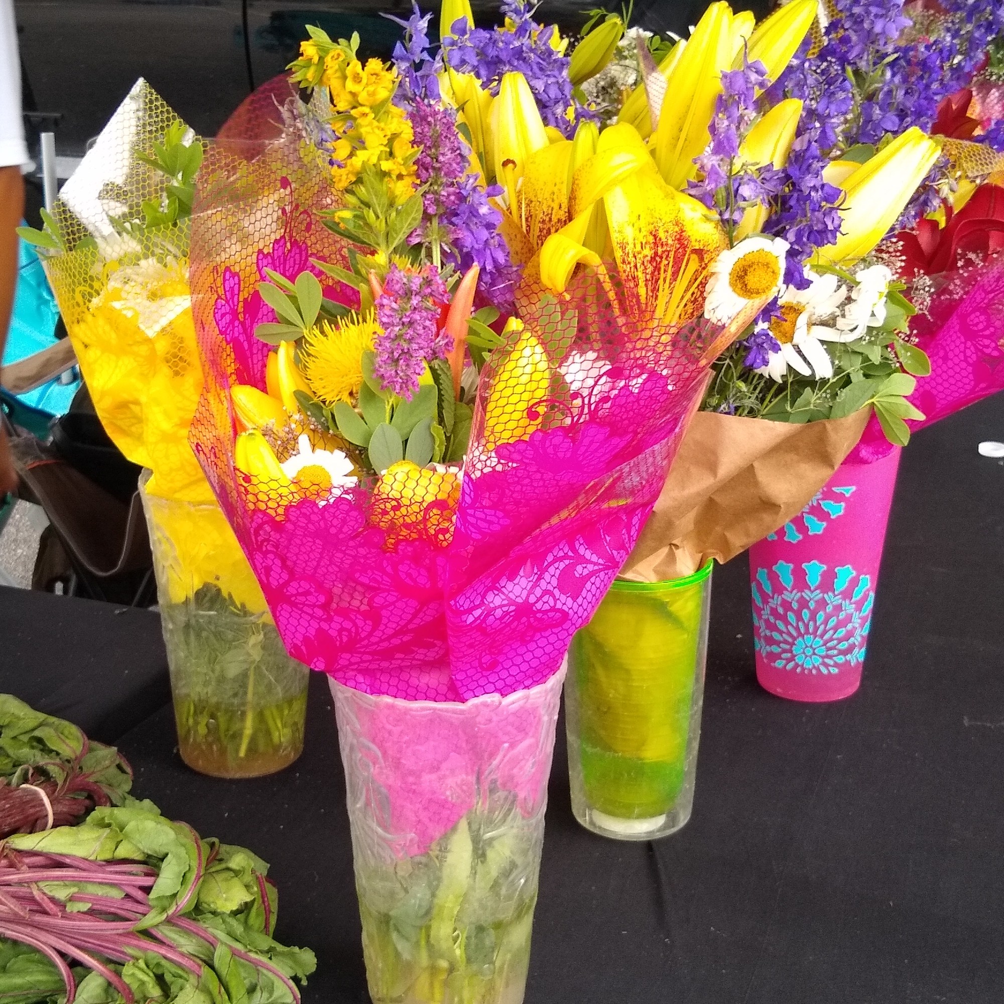 Sunflower Ridge is a generational family farm with three tents and a large variety. This year’s vegetables include beans, beets, pickling cucumbers, garlic, eggplants, kale, ground cherries, kohlrabi, lettuce, okra, onion, sugar snap pea, radishes, summer squash, zucchini, patty pan squash, tomatoes, cherry tomatoes, Swiss chard, green onions, dills, parley, cilantro, basil, rhubarb, and summer corn. Every week, Sunflower Ridge offers custom designed floral bouquets featuring seasonal flowers; peony, bupleurum, asclepies, celosia, dahlias, sweet William, delphinium, fox glove, lupine, kale ornamental, sunflowers, zinnias, fever few, euphoria, marigold, snapdragons, strawflower, and of course, sunflowers.